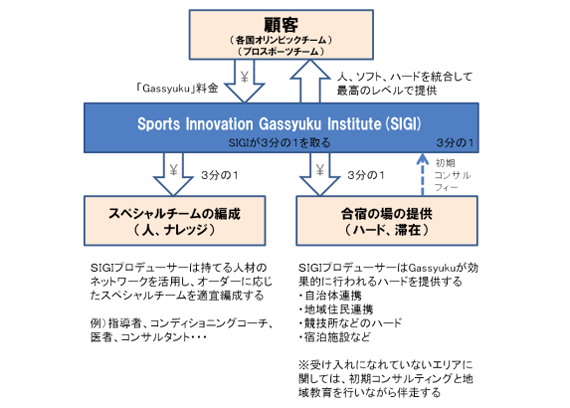 ③顧客に提供する価値=他にないユニークな「Gassyuku」価値の提供 1.飛躍的なレベルアップを果たすために必要な「人」「ソフト(ナレッジ)」「ハード」の3要素を、 2.「日本」という最適な環境をベースに提供する なぜ日本が最適なのか? ④事業スキーム図 ★「ファブレス(工場や大掛かりなオフィス、自社競技場などを持たない仕組み)型」が基本~マーケティングとコンサルテーションを行う「プロデューサー群」をコアとした企業体 ~それ以外の専門家、ソフト、ナレッジ、ハードなどはすべて日本全国からその都度「調達」する ~人材は海外からも招聘できるように、指導者やトレーナーのDBを充実させる (オリンピッククラスの指導者でも、自国では稼げず、海外に行くケースが多い、例えばハンガリーのボート指導者など。 そういった指導者を日本に呼べるようにする) ~今回の東京オリンピックは最大のアピール機会、今後日本で強化合宿を行おうと思うようにマーケティングを行う→オリンピック後の施設の有効活用 ★報酬は3方等分モデルするビジネス ~3分の1はコンサルテーション営業と統合プロデュースを行う SIGI/3分の1は召集される スペシャルチームの報酬/3分の1は合宿の場の提供エリアに ![]() ★記載に無い付随ビジネス・サービスとしては、 ・各国チームに対して日本企業スポンサーの紹介(成功報酬型で紹介料金を) ・プロジェクトにインターンとして学生やスポーツ業界志望社会人が有料で参加できるようにする(インターンを通じた成長機会の提供) |