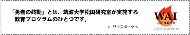 による産学連携型教育・研究成果の社会還元活動として実施されています。 よって導入講義は、今季推進してきた研究成果発表・考察セッションとして、勇者講義は、 今季学内で実施された「未来構想大学講座『勇者の鼓動』」のアンコールセッション(一部リニューアル)として行われます。 ※企業共同研究(㈱スポーツビズ・アスリートライフLLC)、筑波大学産学連携推進プロジェクト、 科学研究費助成事業(挑戦的萌芽研究)としての採択を受け実施されています。 リサーチグループメンバー (順不同) 相原正道 福山大学経済学部准教授 高柳公一 株式会社インターファースト・代表取締役社長 田中和弘 株式会社スポーツビズ取締役 小俣よしのぶ ㈲日本スポーツトレーニング研究所所長 松田裕雄 筑波大学体育系講師 高橋義雄 筑波大学体育系准教授 渡和由 筑波大学芸術系准教授 武田丈太郎 新潟医療福祉大学講師 |