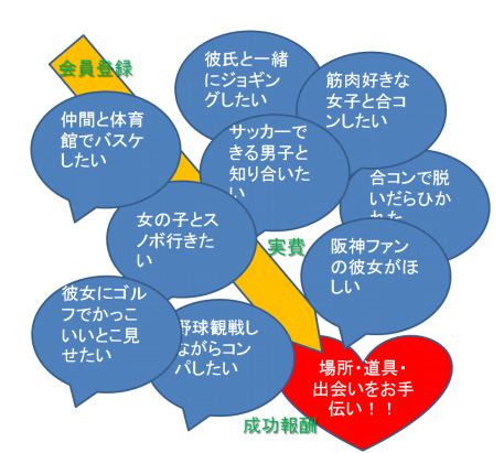 (体育館、グラウンドの手配、車や道具のレンタル、技術指導、教え方の指導) 2.スポーツで出会いたいグループ同士のコンパのセッティング! (見せたい側の試合をセッティング、一緒にできる場のセッティング) 3.スポーツをテーマにした大規模なお見合いイベントの実施 社会的意義